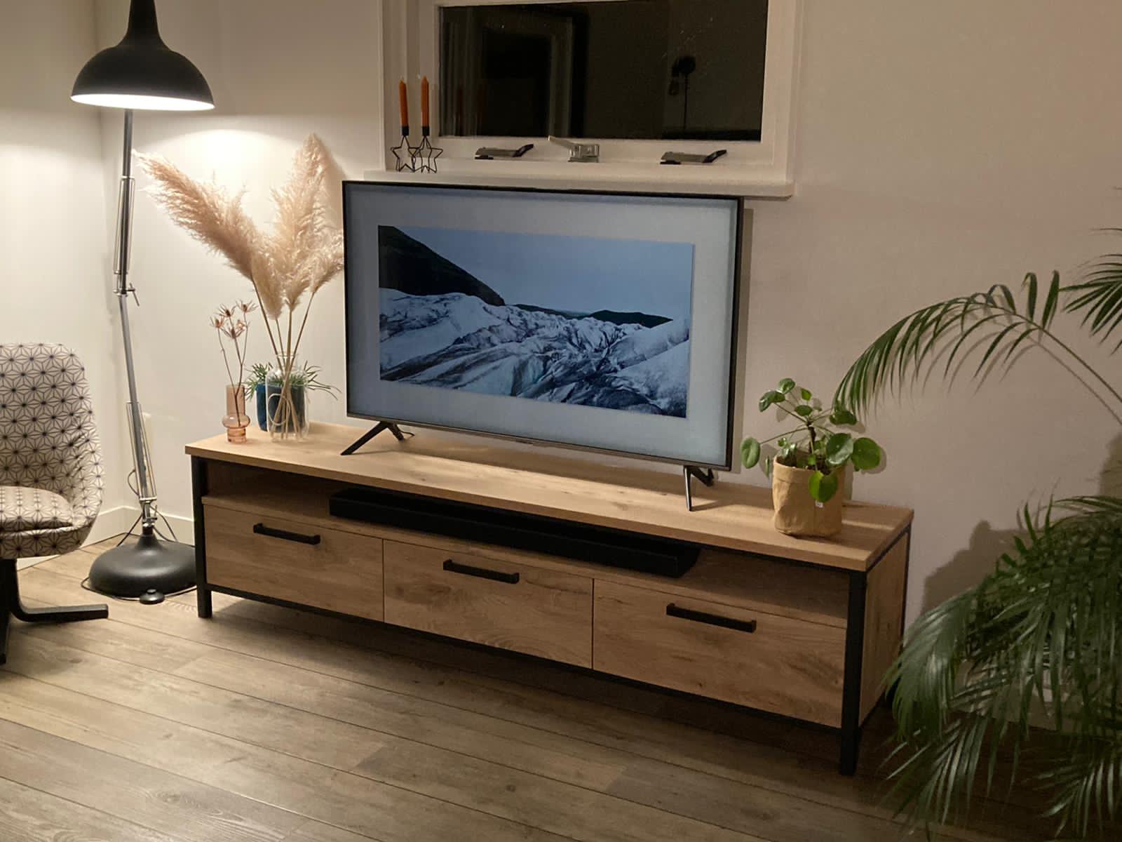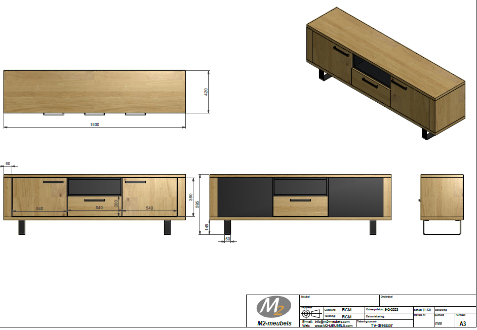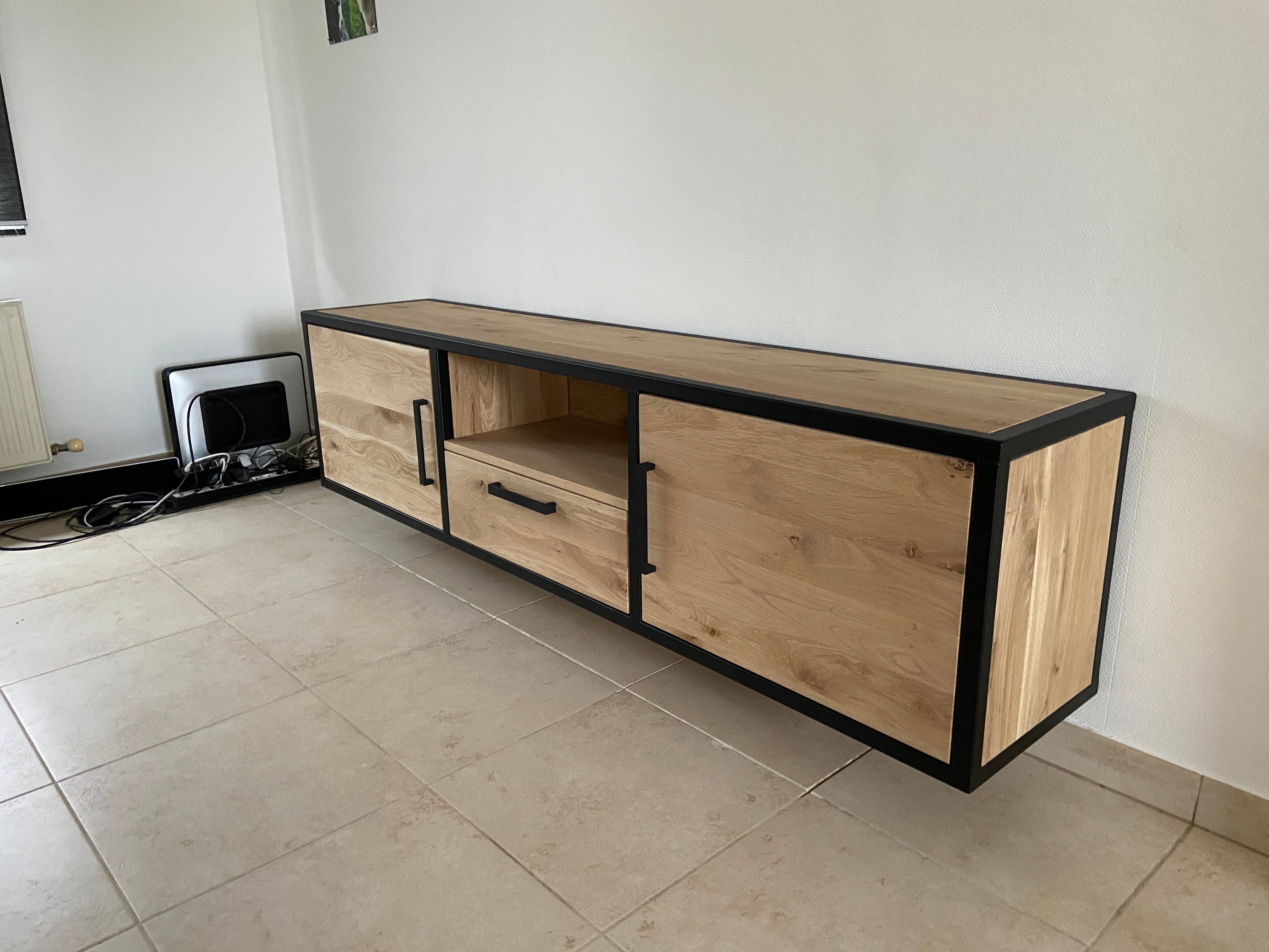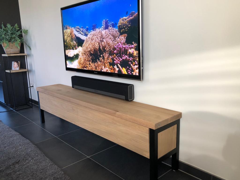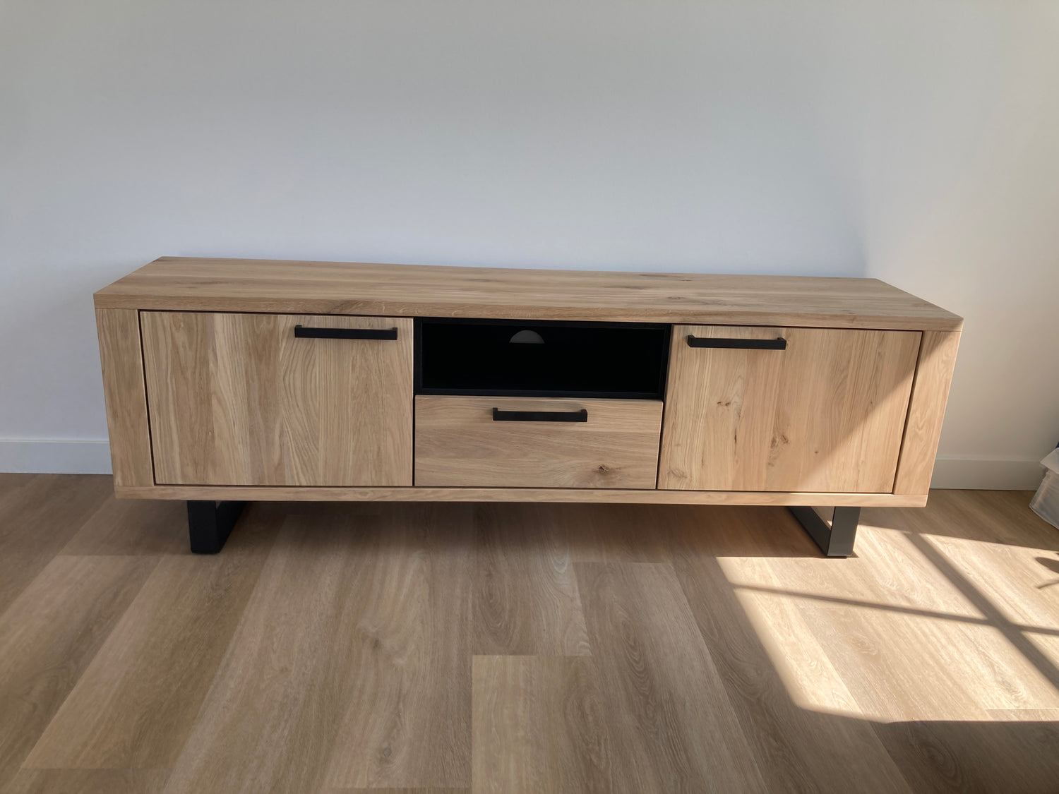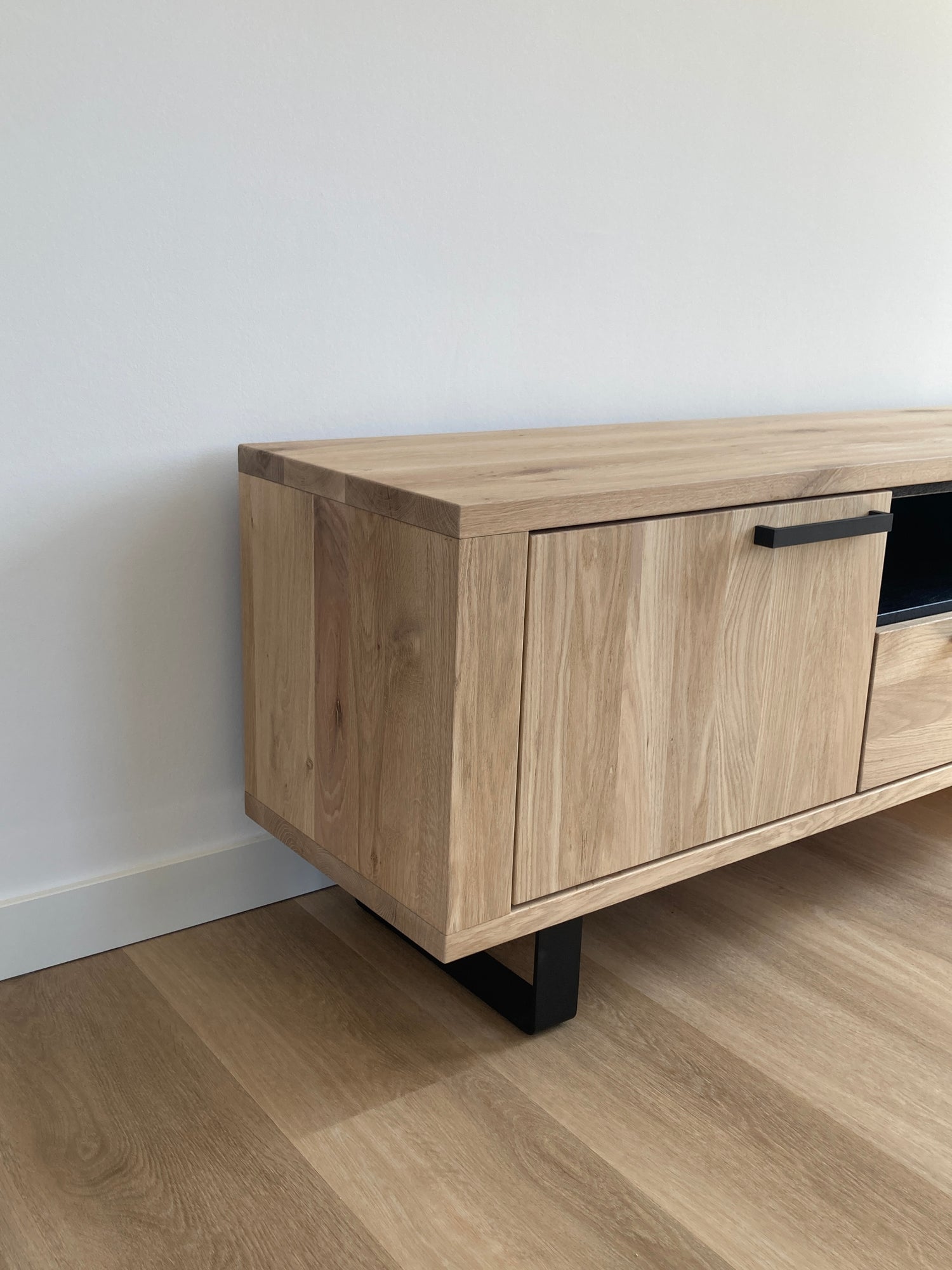 M2-meubels maakt ook TV-dressoirs op maat. Dit dressoir is gemaakt van massief eikenhout en afgewerkt met zwarte elementen.