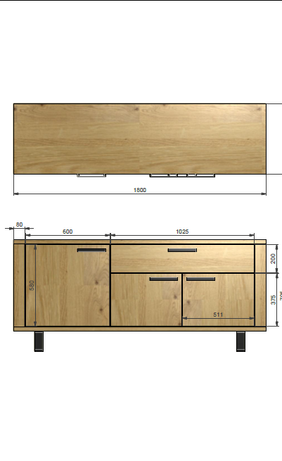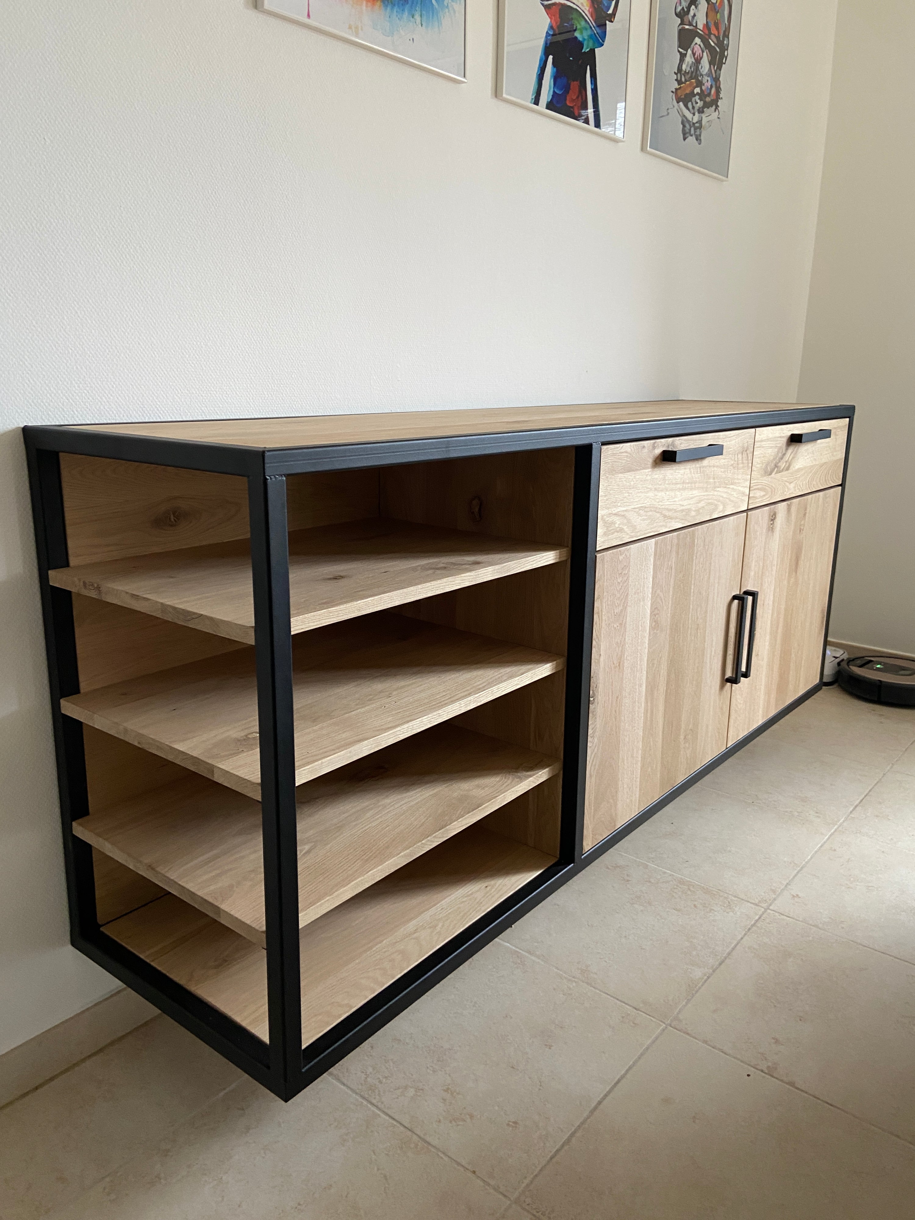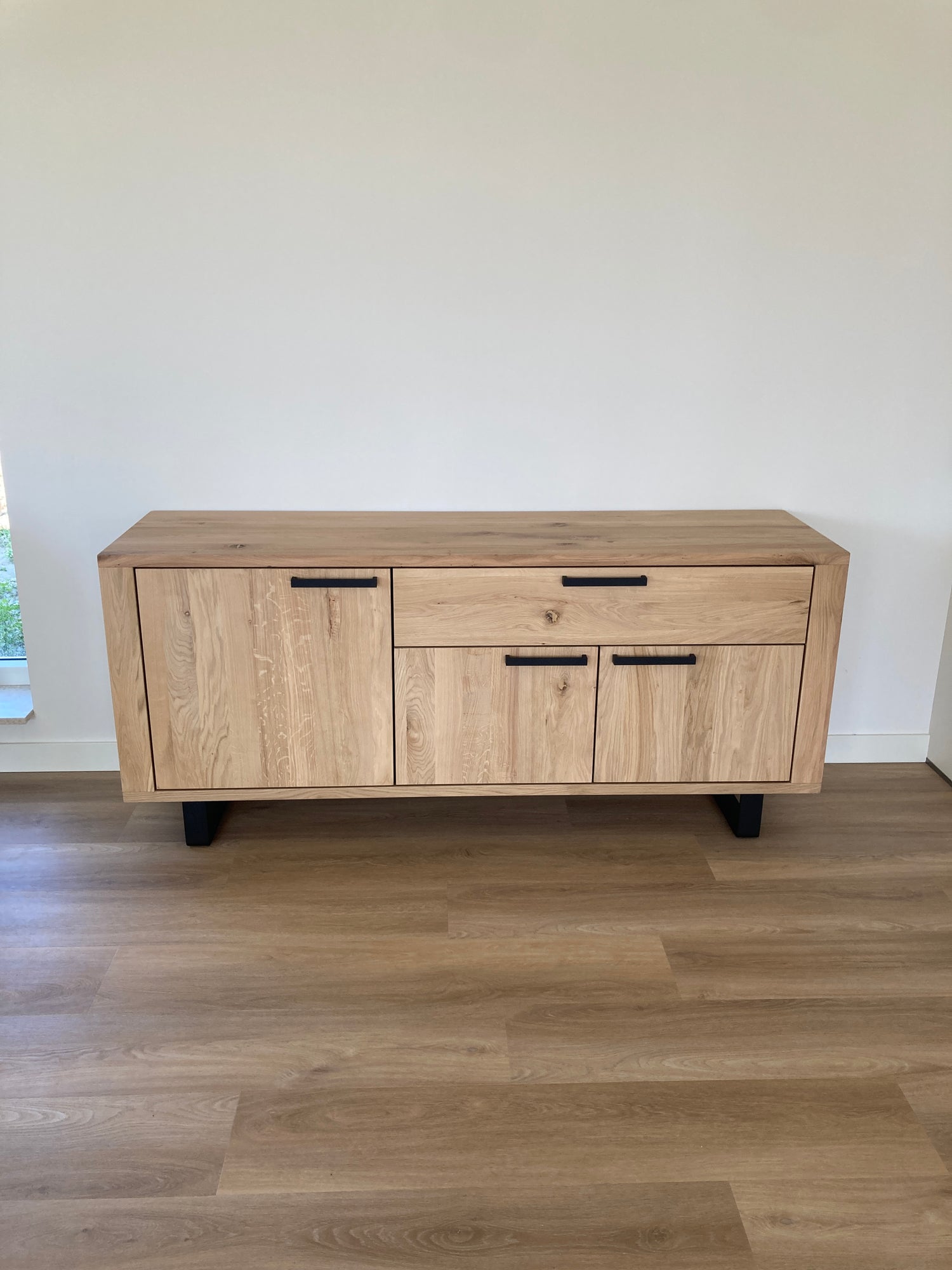Dit dressoir is gemaakt van massief eikenhout en voorzien van maatwerk onderstellen. De deuren en lades zijn voorzien van zwarte grepen en de binnenzijde van de kast is afgewerkt met zwart mdf.