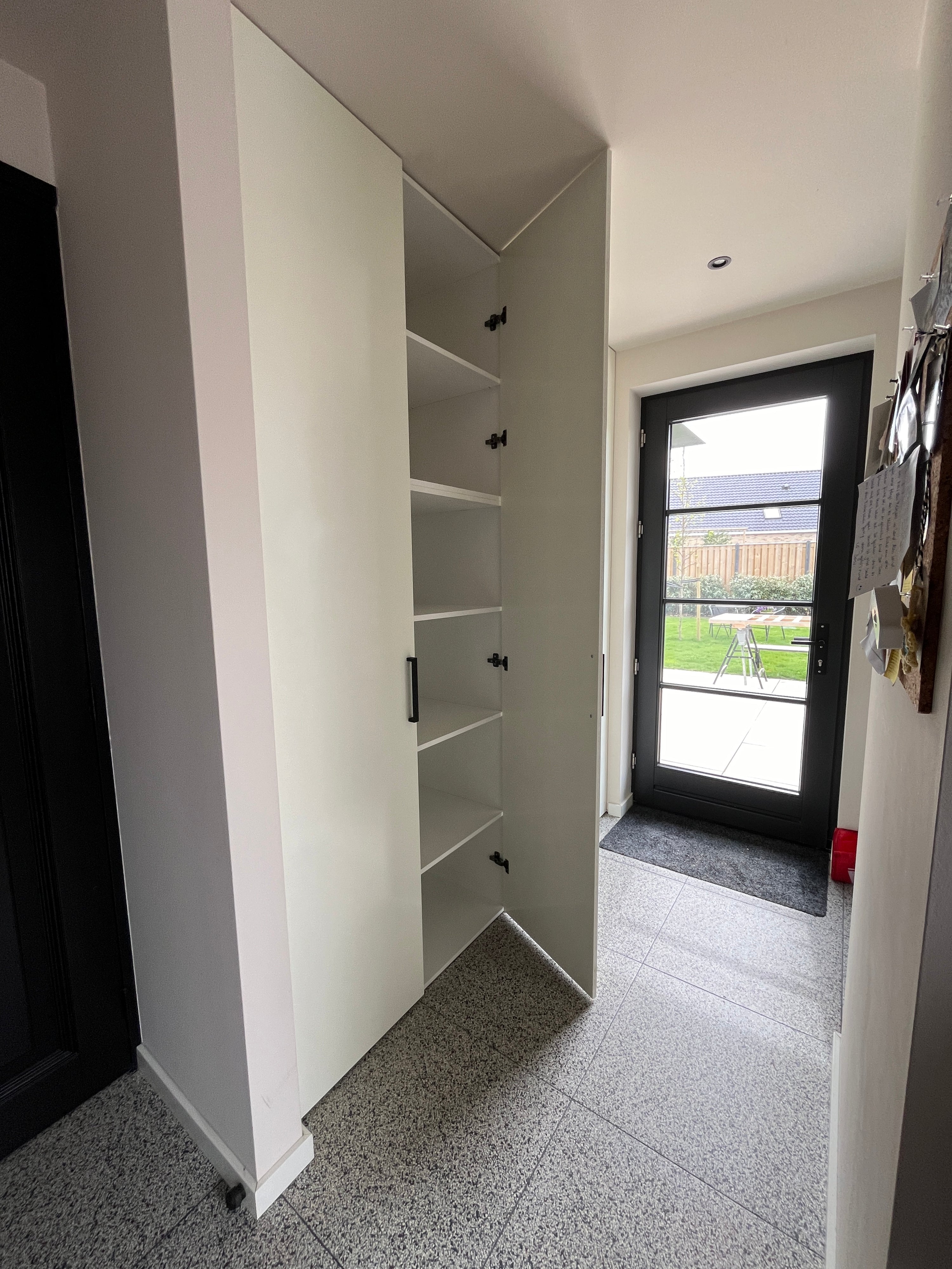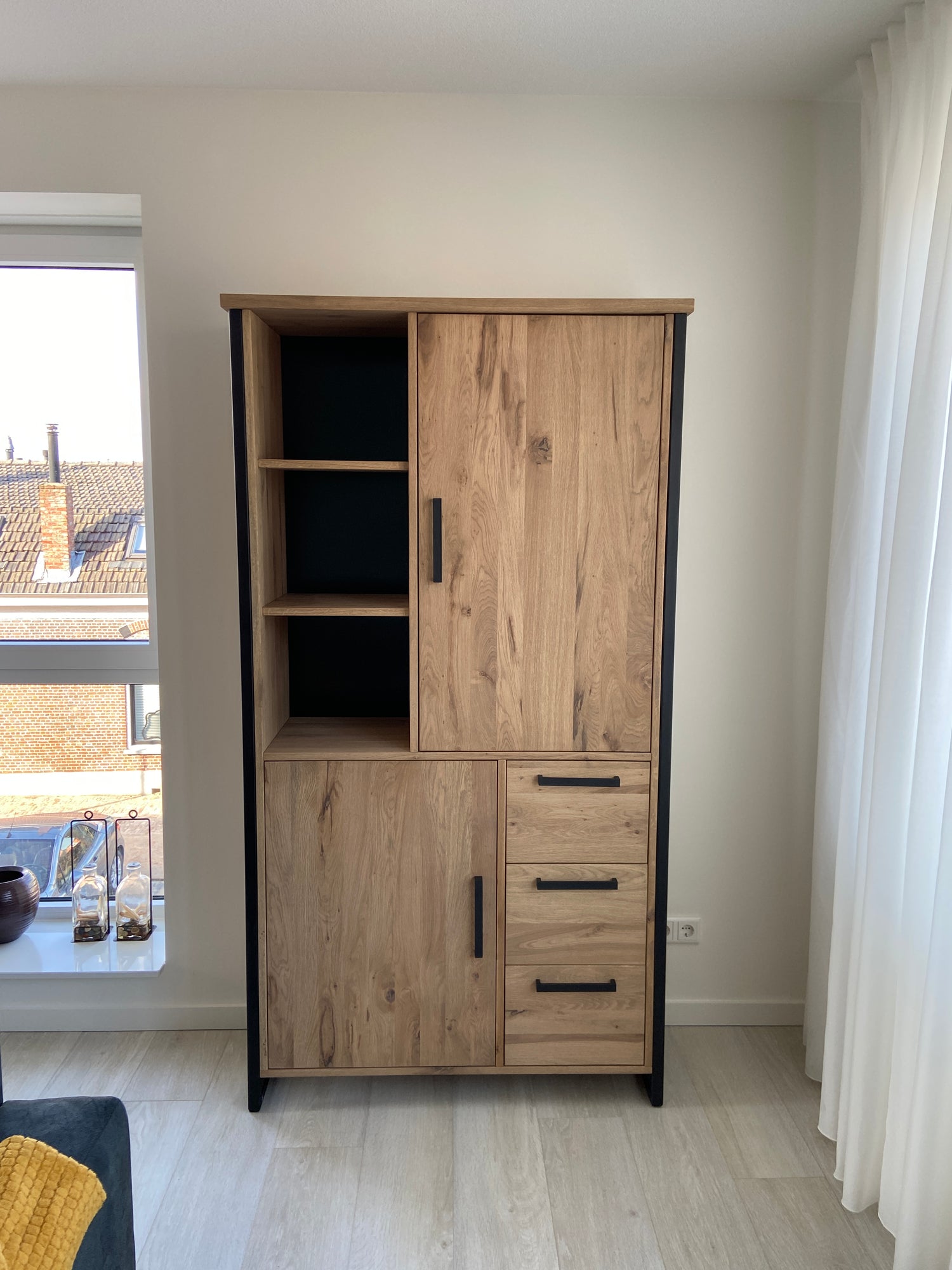 De klant was opzoek naar een hoge kast met zowel open vakken, deuren en lades. Ons voorstel voor een eikenhout /staal combinatie viel in de smaak en zo kwamen we tot dit ontwerp.