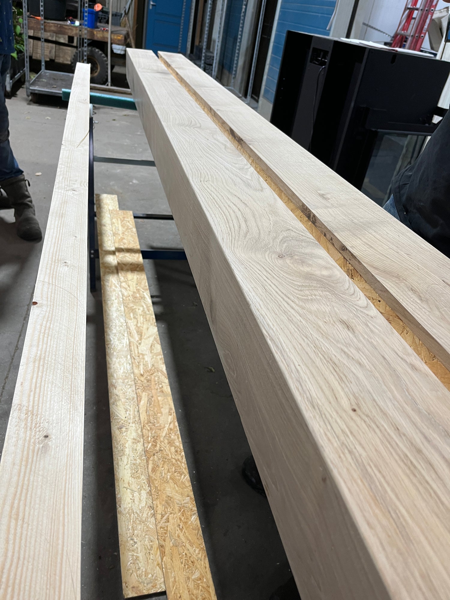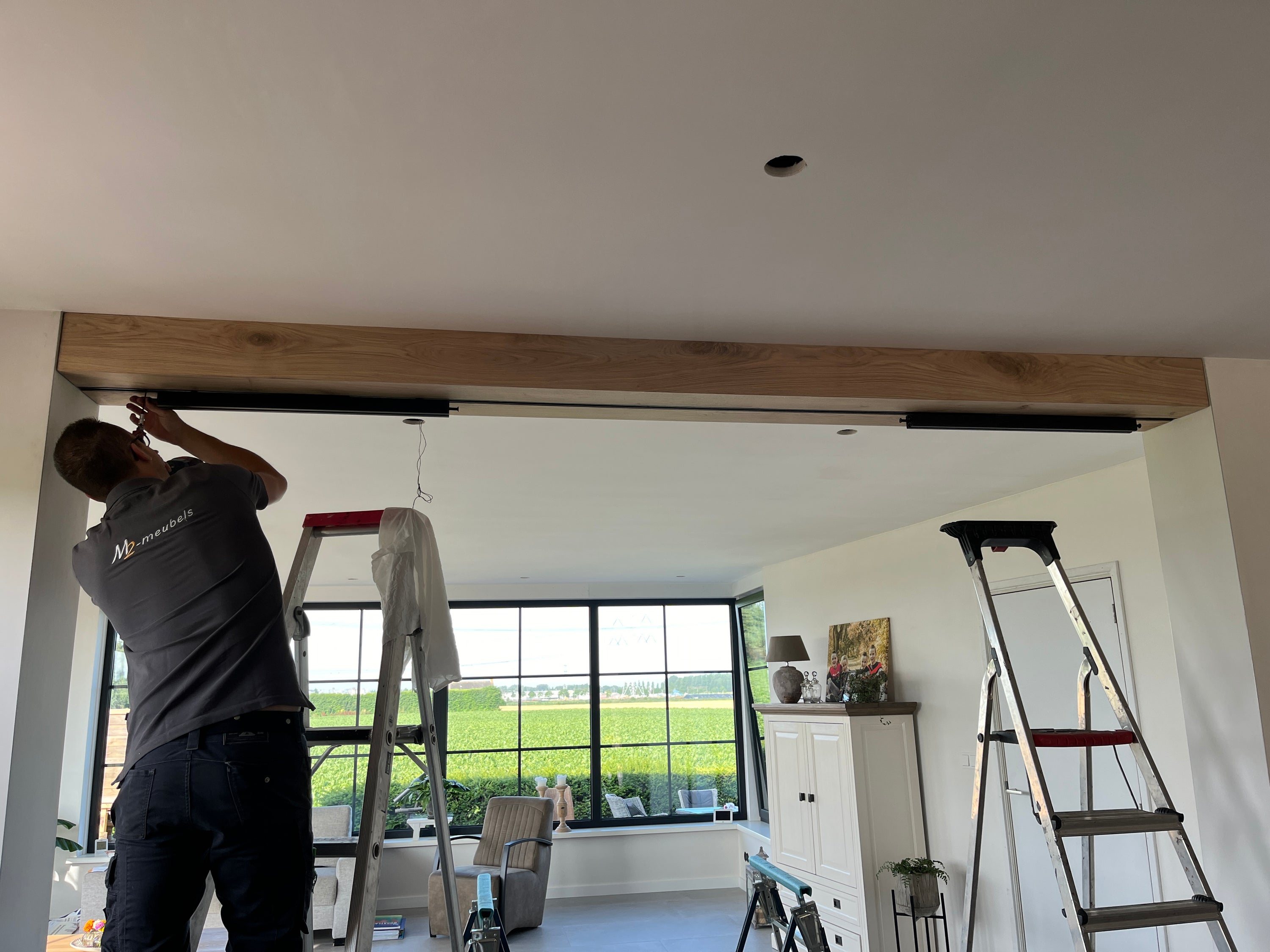 Omdat de plafonds in de verschillende ruimtes niet gelijk waren vroeg de klant ons een eikenhouten koof te maken en daarin de rails van de schuif deuren te verwerken. We verlijmde de koof van massief geschaafd eikenhout.