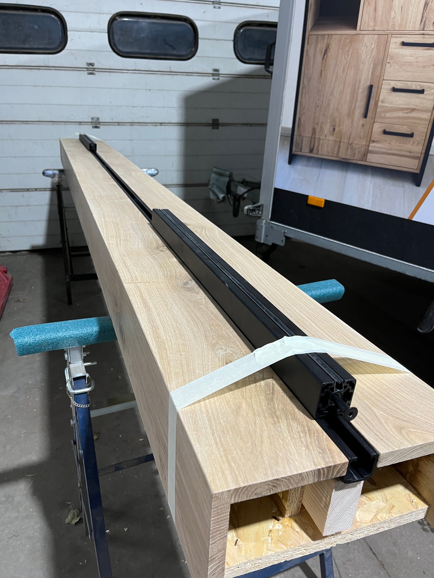 Voor het ophangen van de deuren monteerde we in de eiken koof een mat zwart railstysteem met softclose sluiting.