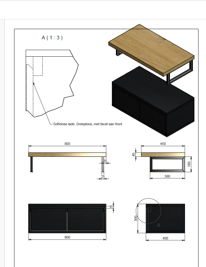 Een zwart eikenhouten meubel met lades en een los blad met stalen steunen voor het ophangen van een handdoek.