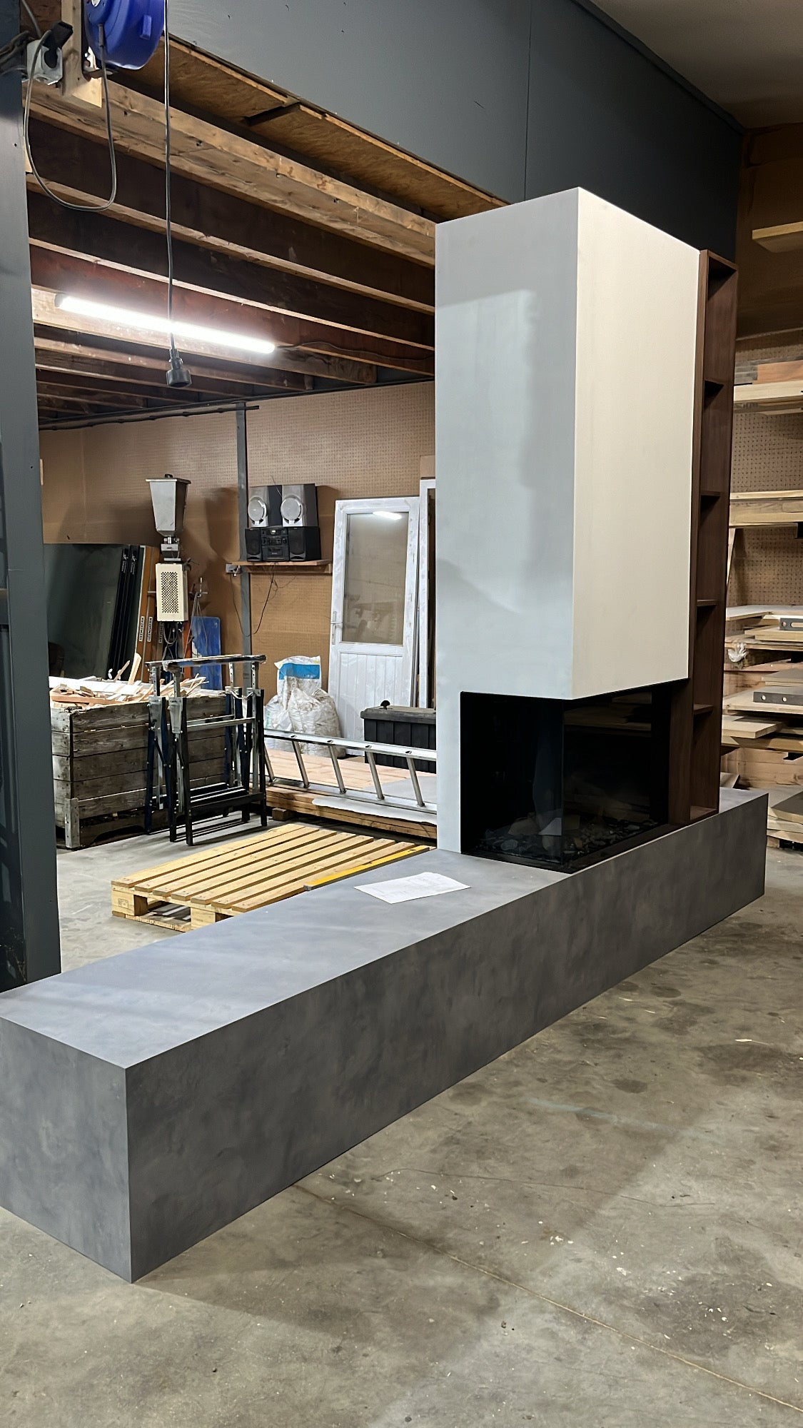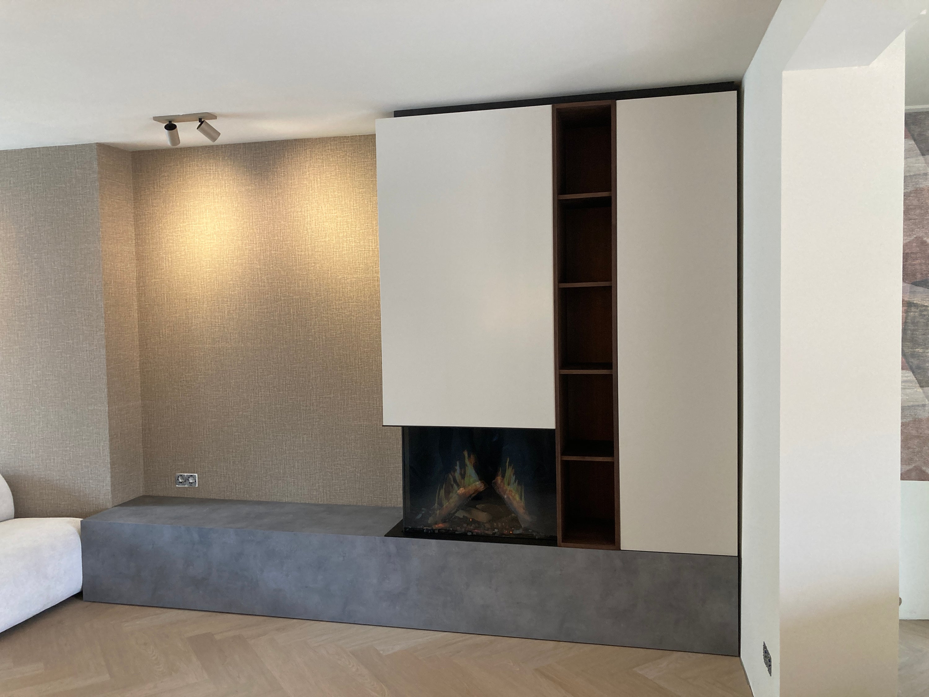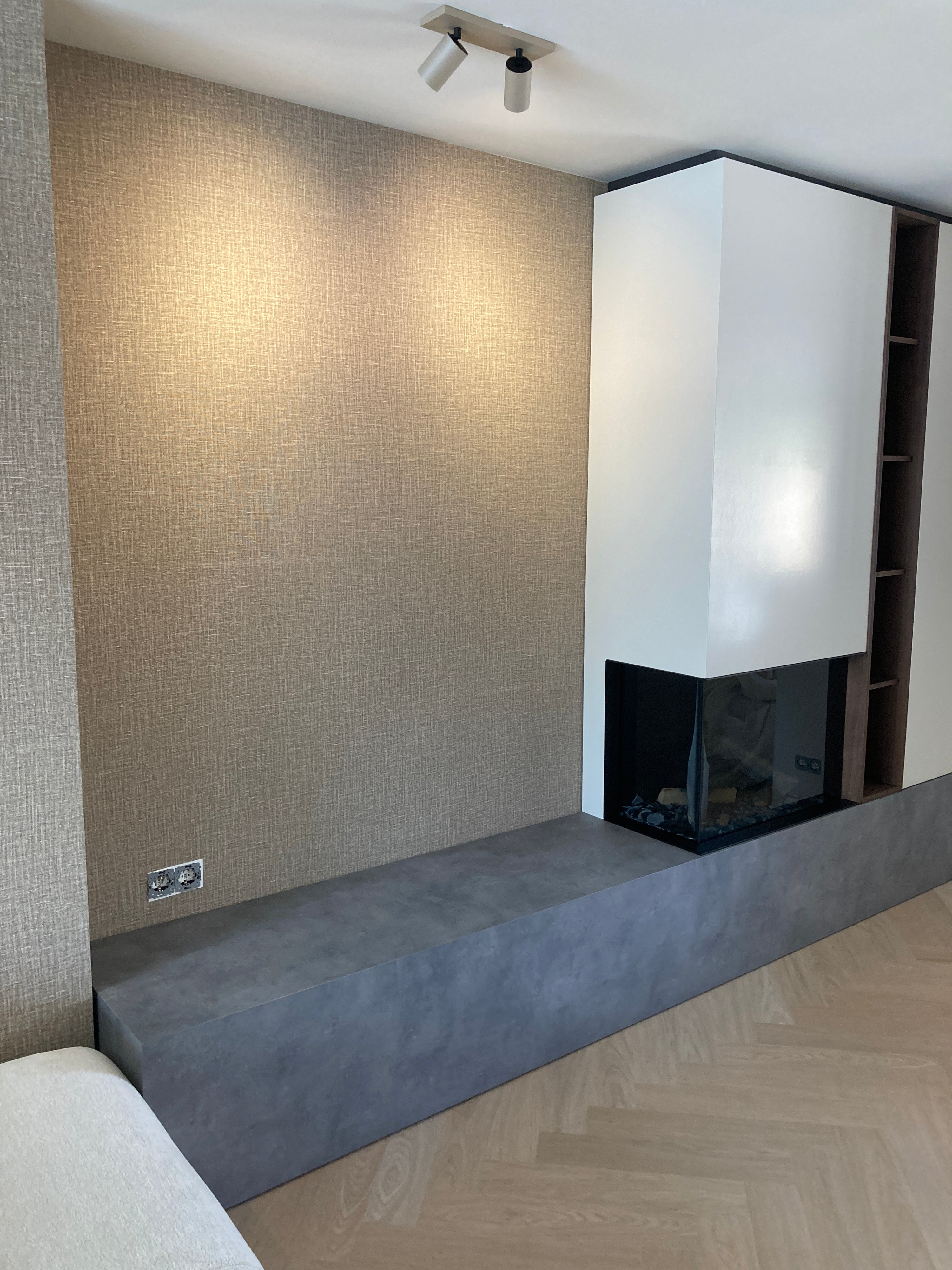 Voor het afwerken van de haard verzorgde we een koof die doorloopt tot aan het plafond.