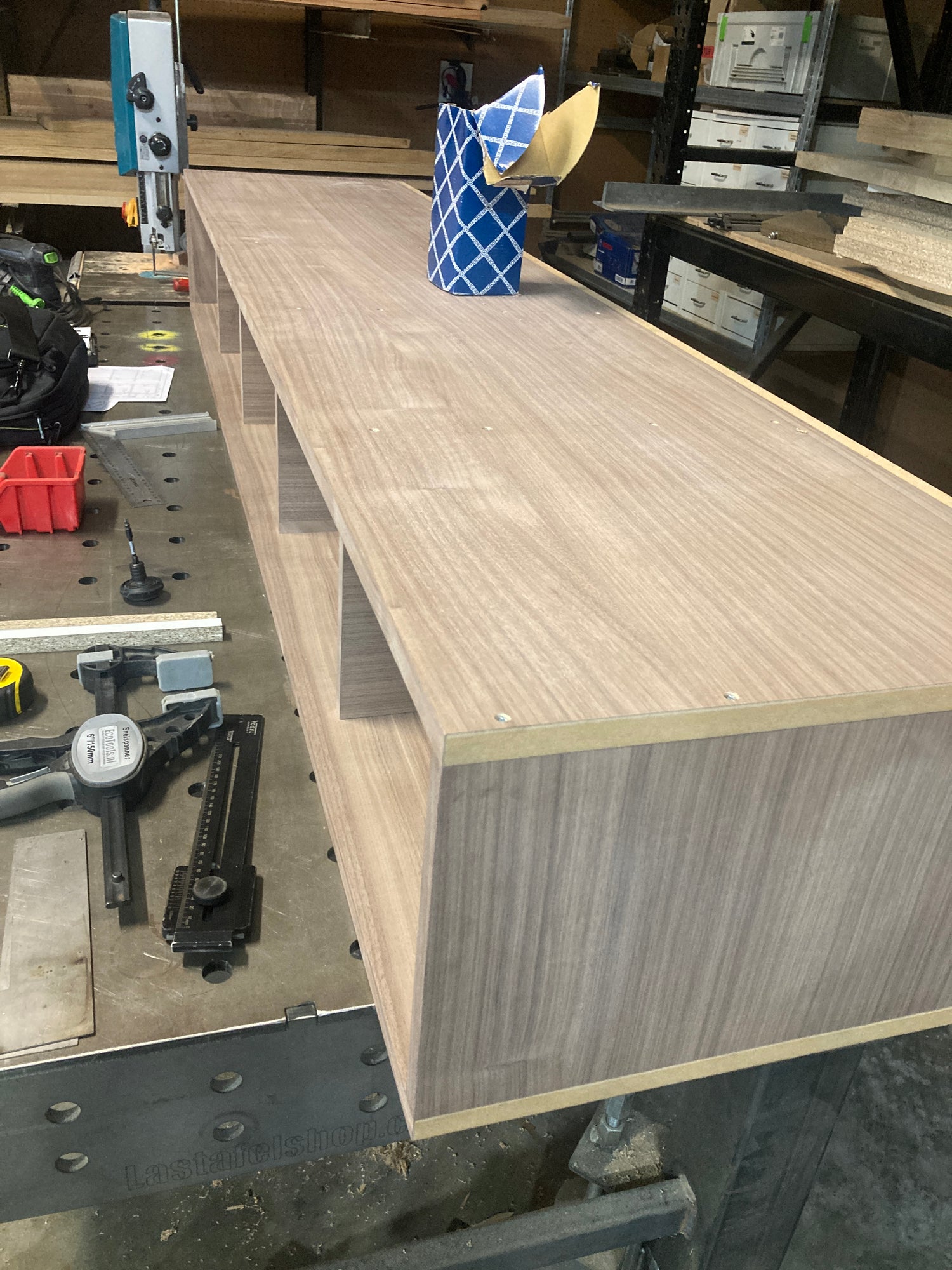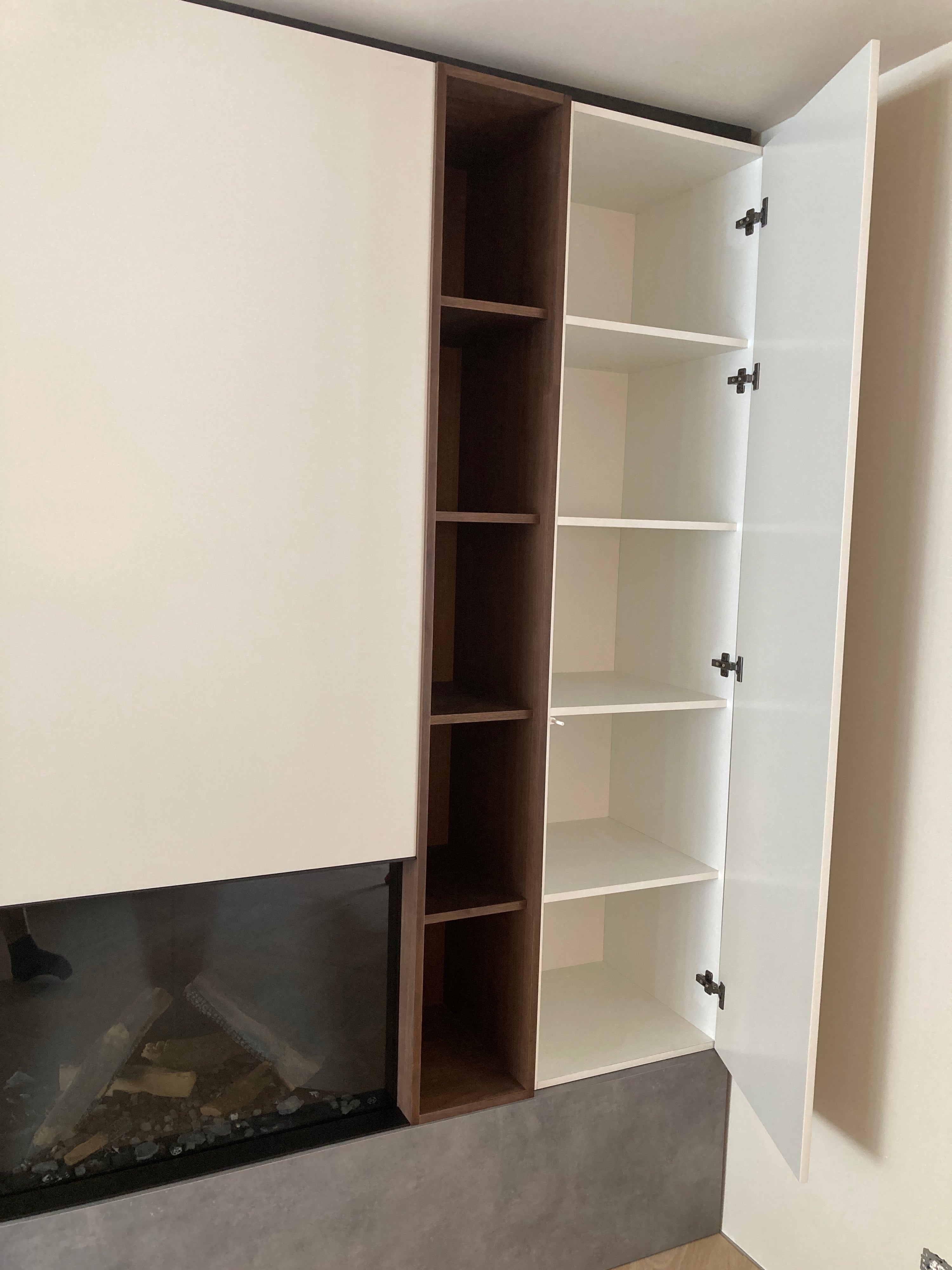 Tussen de koof van de haard en de dichte kast met leg boarden maakten we een kast met open vakken gemaakt van noten fineer. Het noten fineer behandelde we in met een olie waardoor het een mooie warme kleur kreeg.