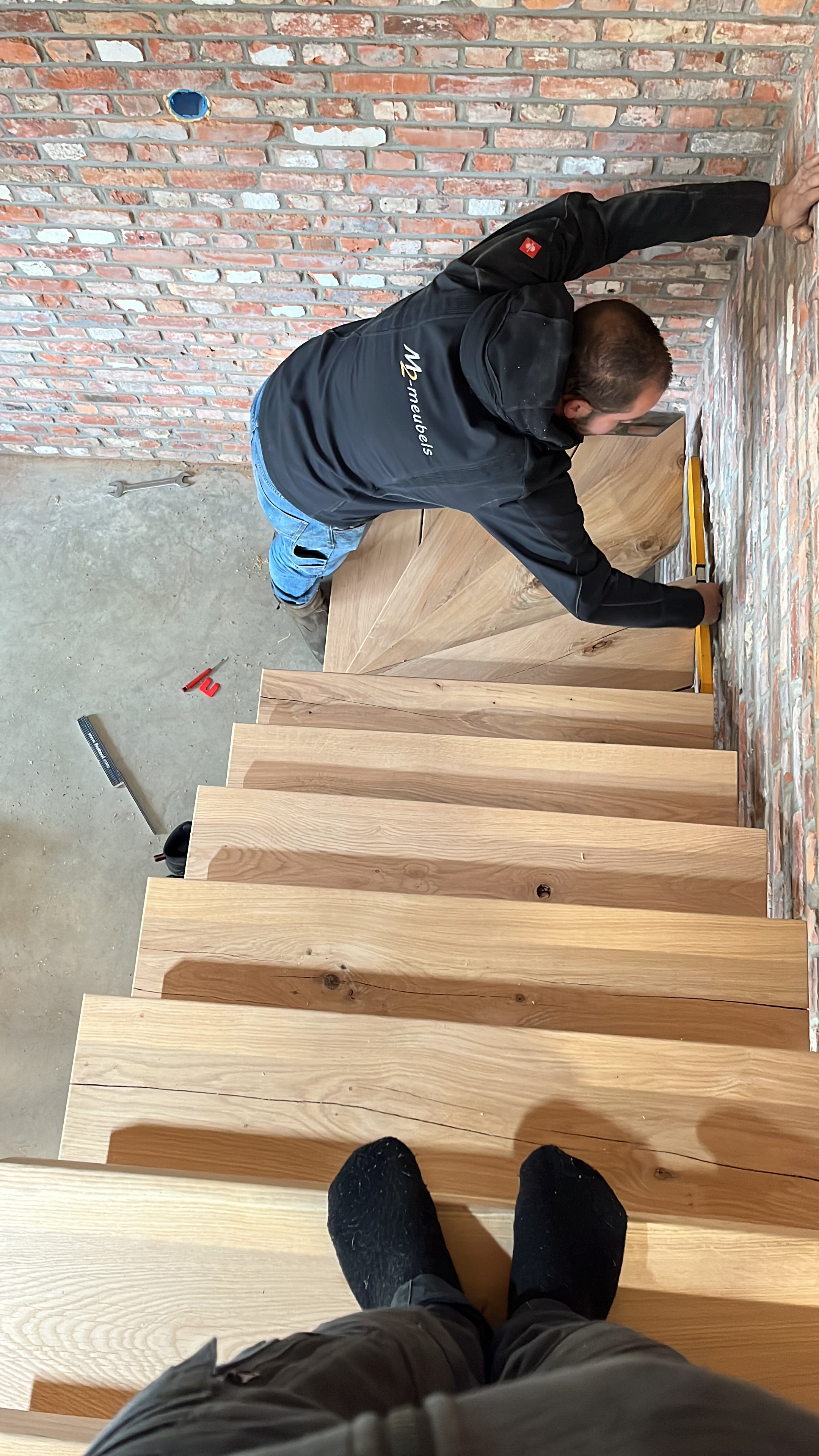 De traptreden zijn op maat gezaagd en de kanten zijn gefreeds. Het eikenhout van 70mm dik zijn afgewerkt met een vocht en vuil afstotende beschermlaag