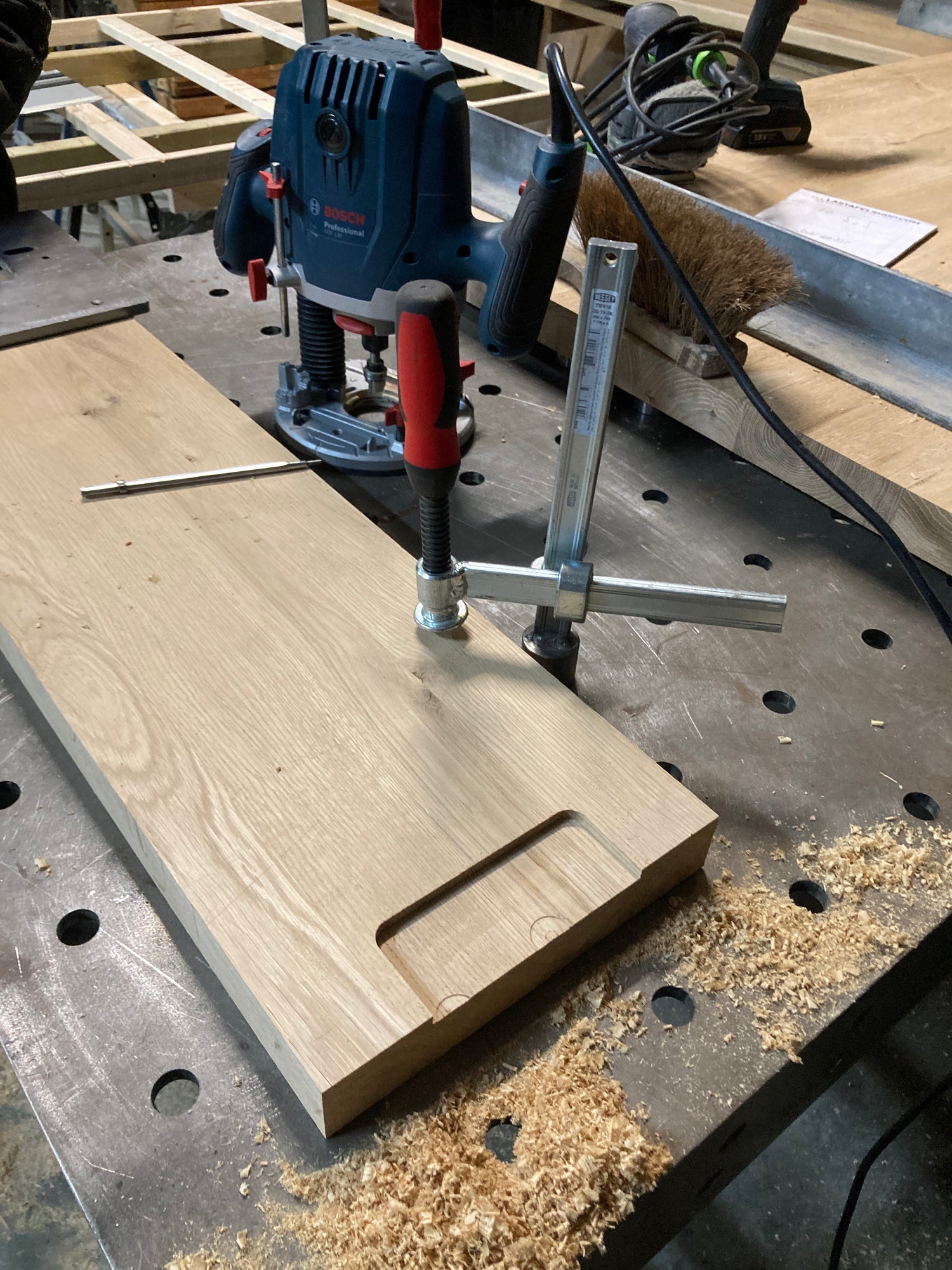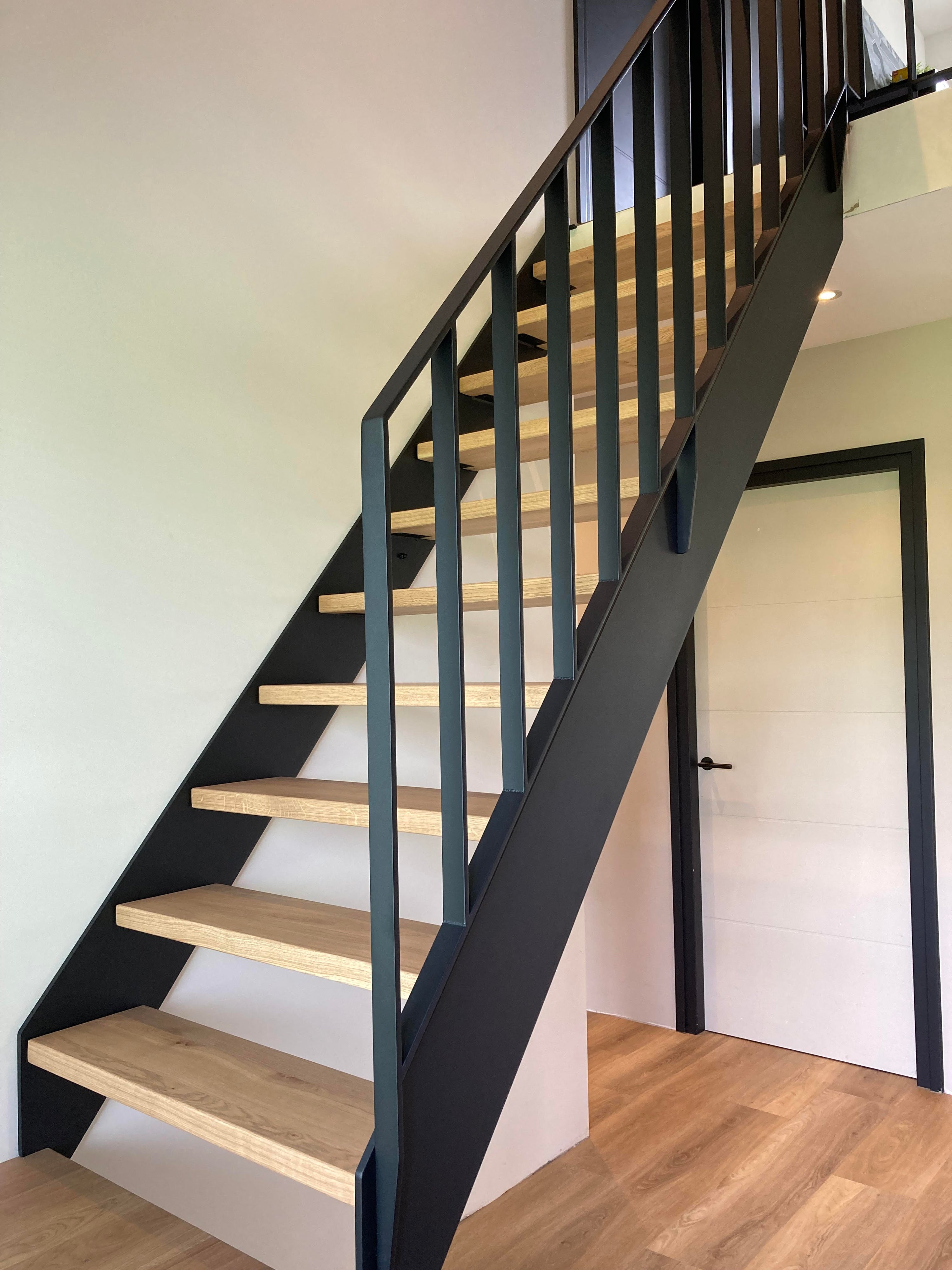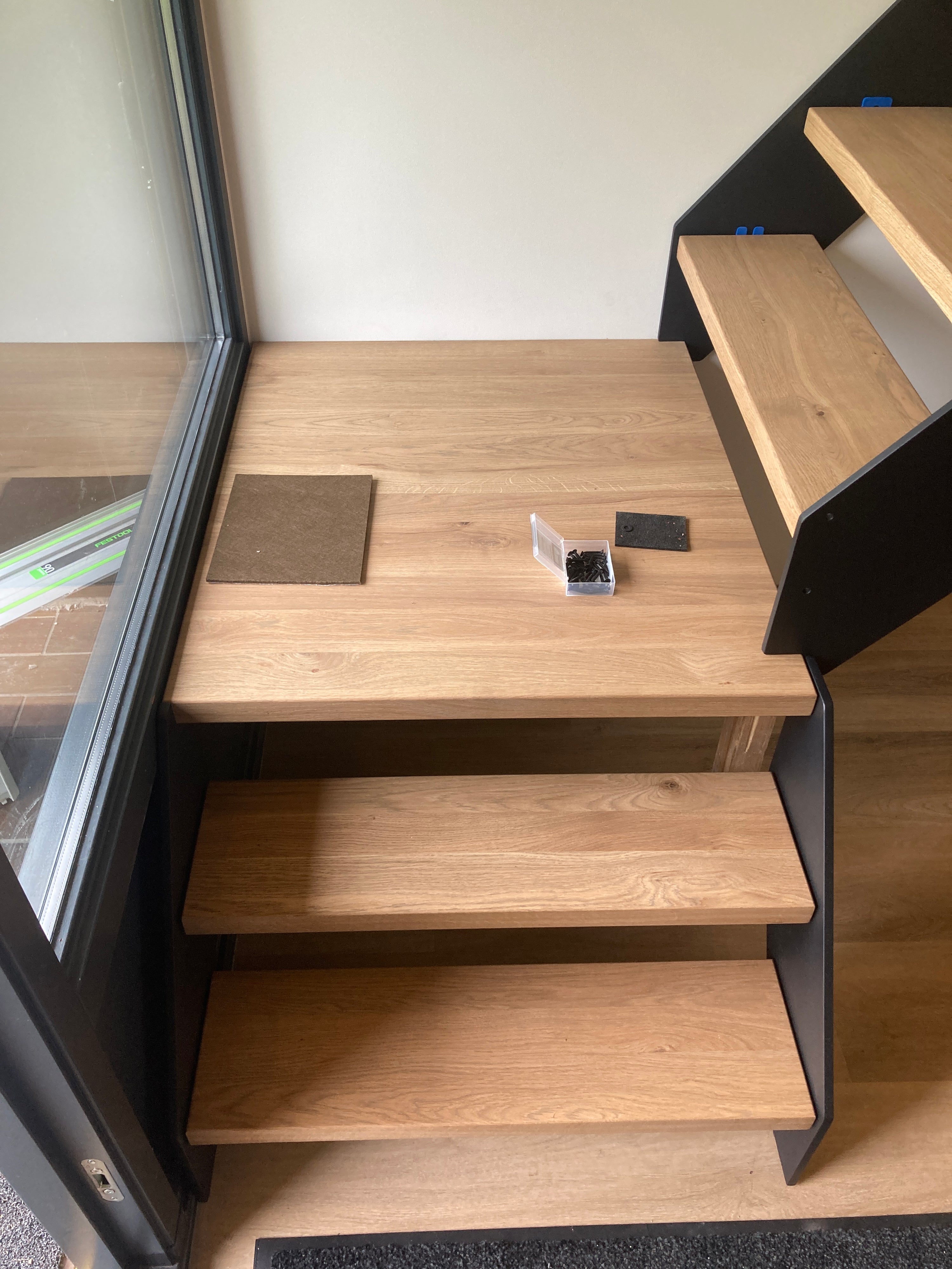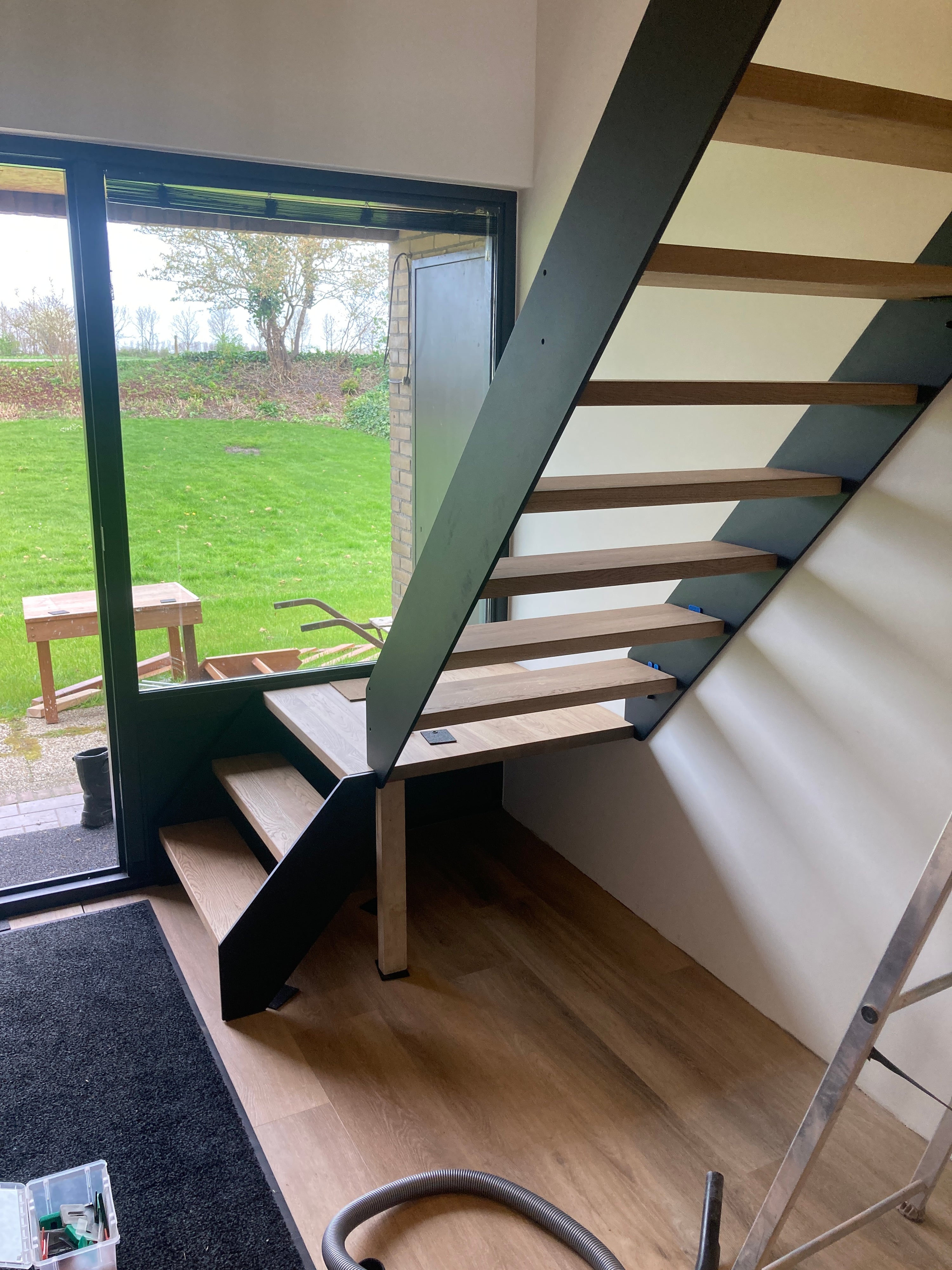 De traptreden zijn op maat gezaagd en de kanten zijn gefreeds. Het eikenhout van 40mm dik is behandeld met een kleurolie naar wens van de klant en afgewerkt met een vocht en vuil afstotende beschermlaag.